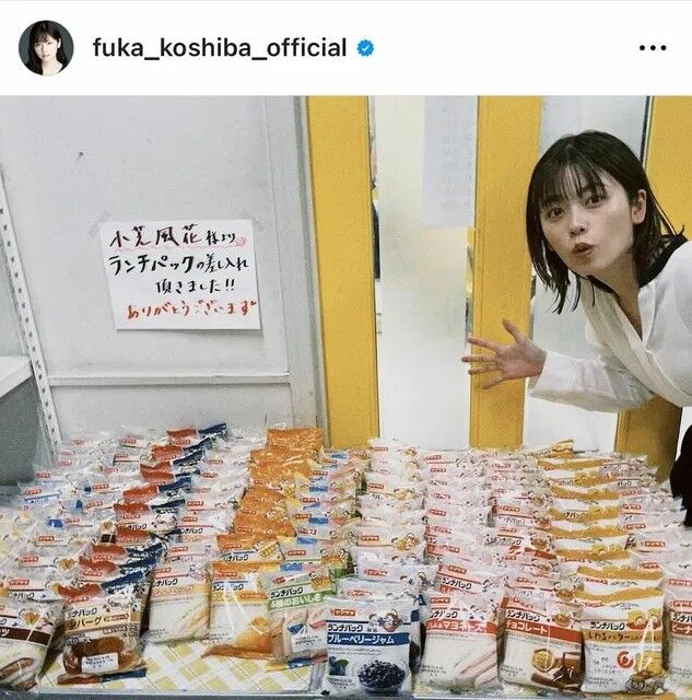 「『転職の魔王様』第4話 本日22:00~放送です ぜひご覧ください 山崎製パンさんが 現場に『ランチパック』の差し入れくださったのです いつもありがとうです」と記した小芝。自身がCMキャラクターを務めるランチパックがズラリと並ぶ模様を前にかわいらしい表情を見せた。