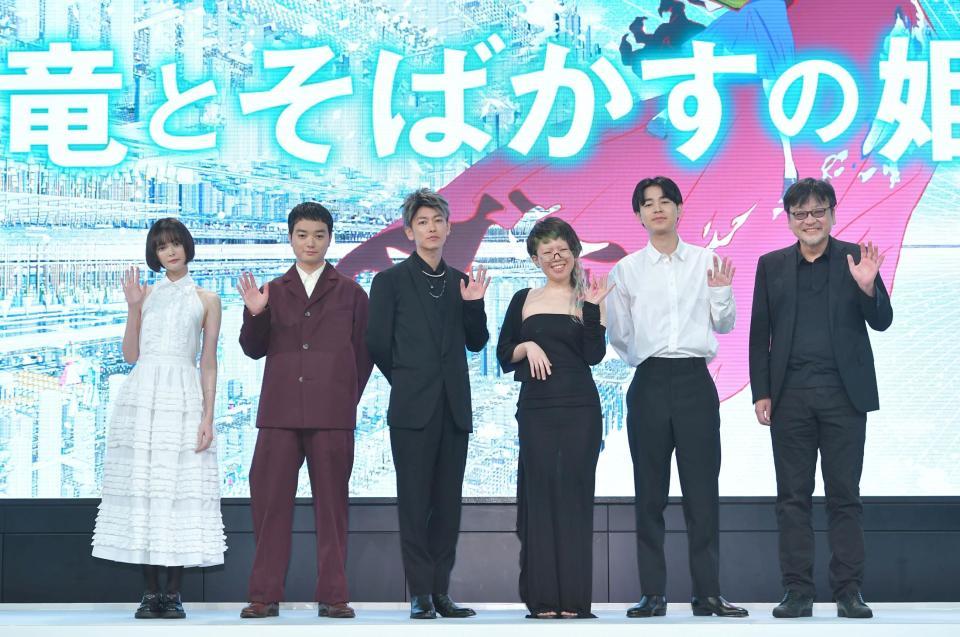 キャストの玉城ティナ、染谷将太、佐藤健、中村佳穂、成田凌、監督の細田守