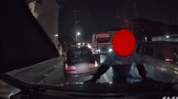 しばらくすると男は自分の車へ。ところが、男はフロントに飛び乗ろうとしたのです。