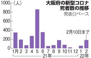 大阪府で新型コロナウイルス感染者の死亡が増えている。「第6波」の死者のうち80代以上が7割を占めており、府は高齢者への感染の広がりが影響していると分析する。府内の死者総数は9日発表で3278人となり、東京都(3269人)を再び上回った。